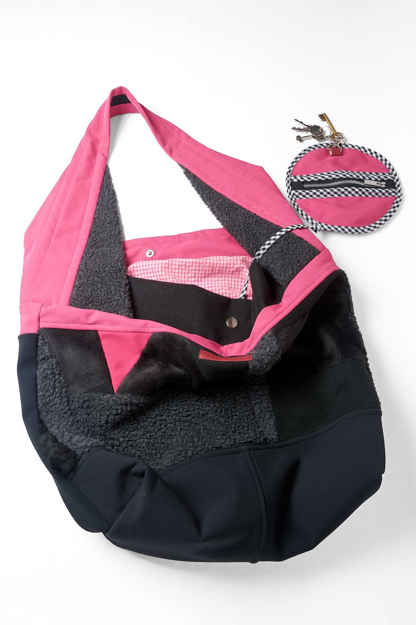 Bolso rectangular con bolsillo y monedero extraíble con llavero, completamente forrado.