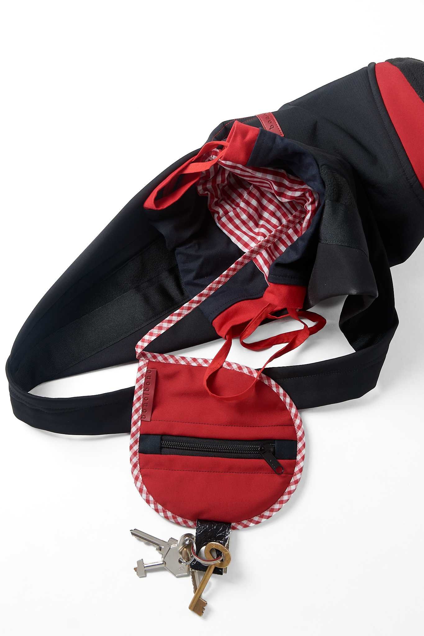 Bolso rectangular con bolsillo y monedero extraíble con llavero, completamente forrado.