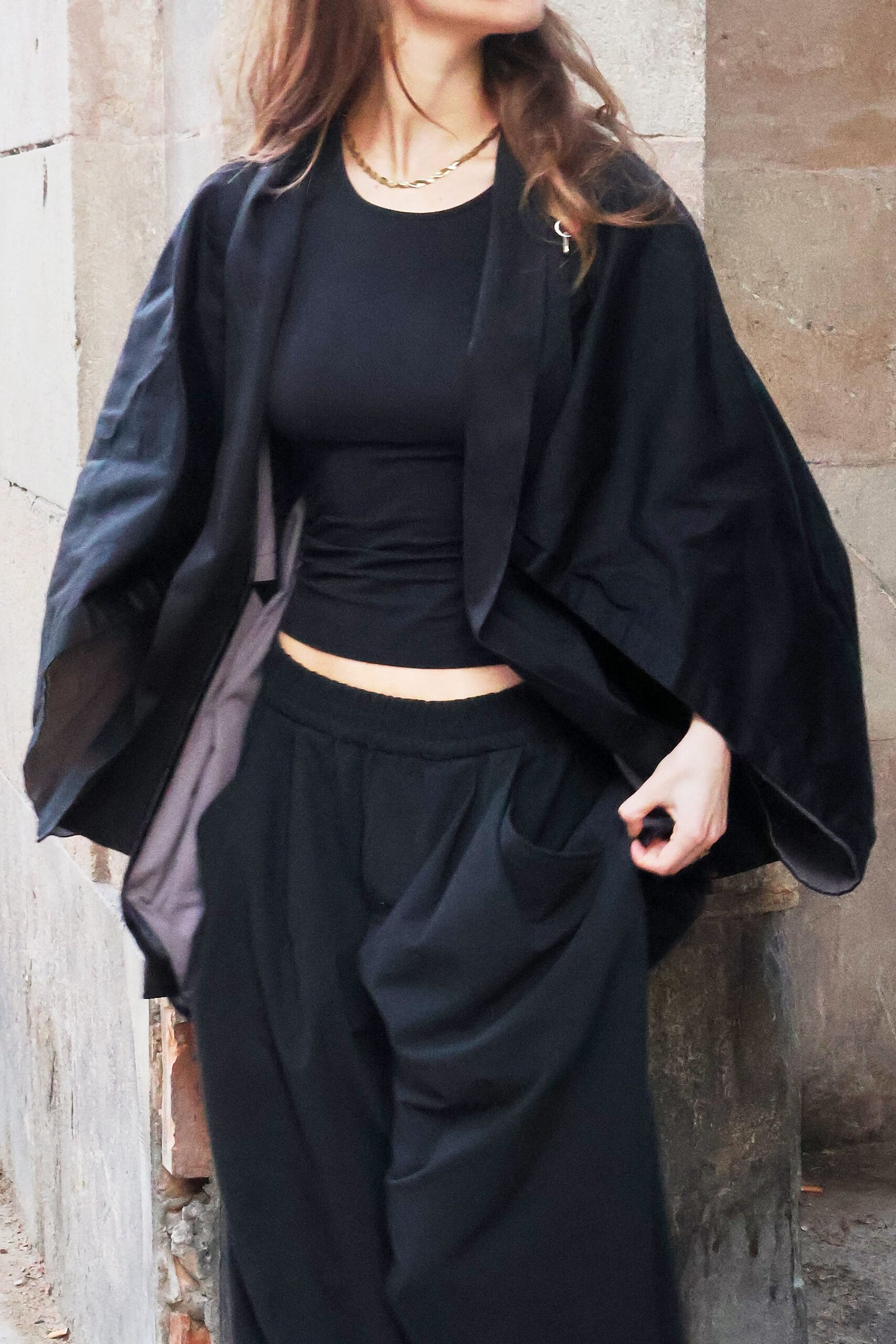 – Puedes usarla suelta o añadir un cinturón para marcar la cintura, generando un contraste moderno entre el frente y la espalda.