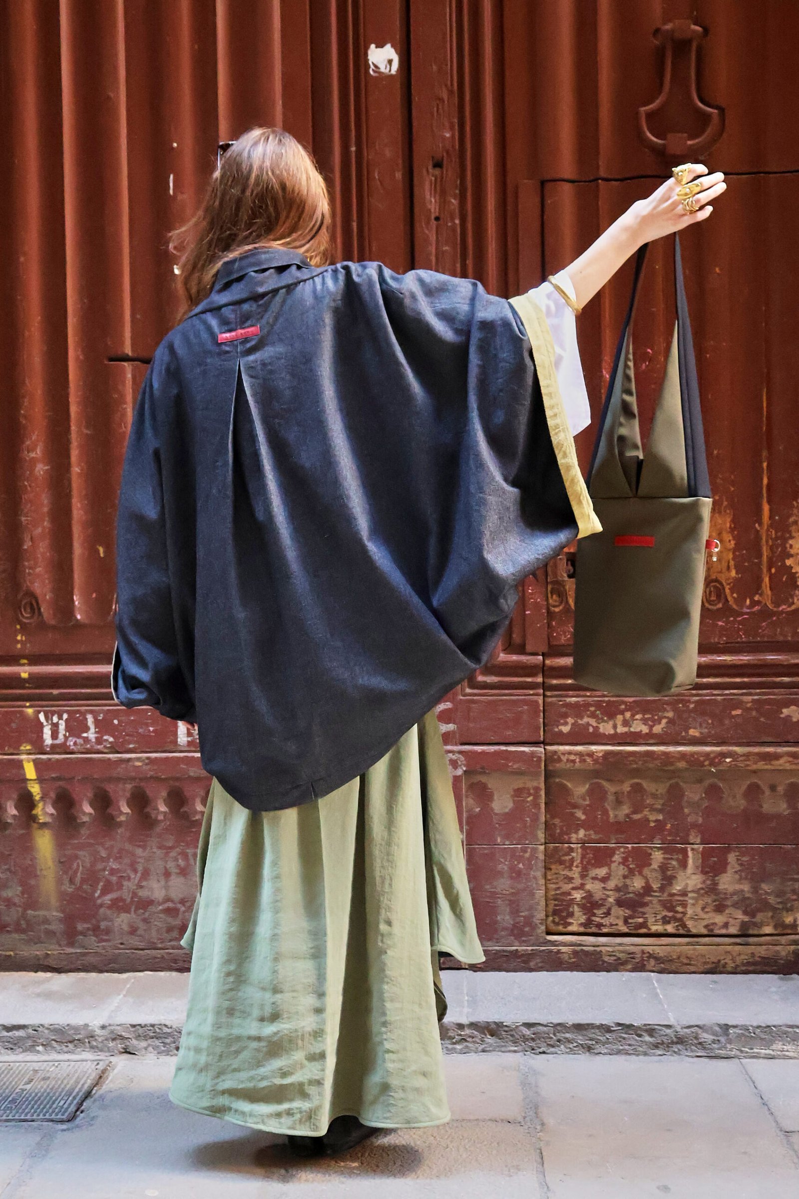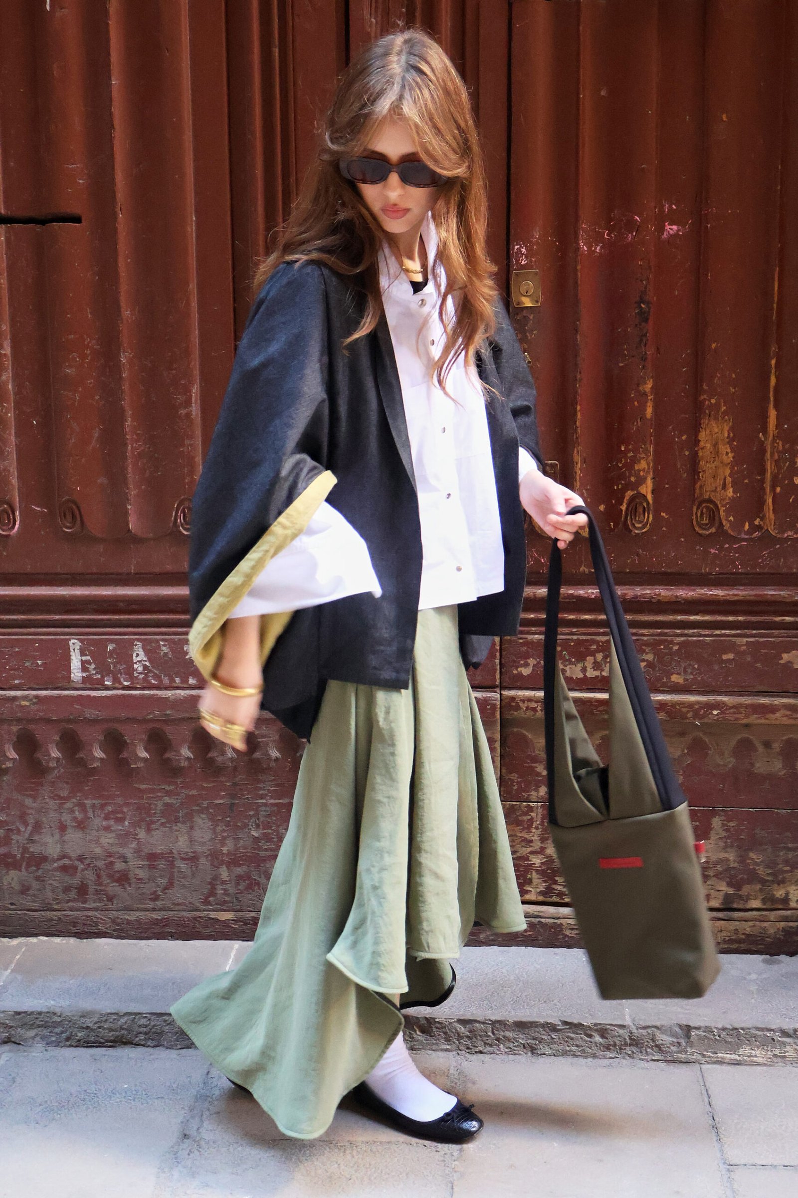– Puedes usarla suelta o añadir un cinturón para marcar la cintura, generando un contraste moderno entre el frente y la espalda.